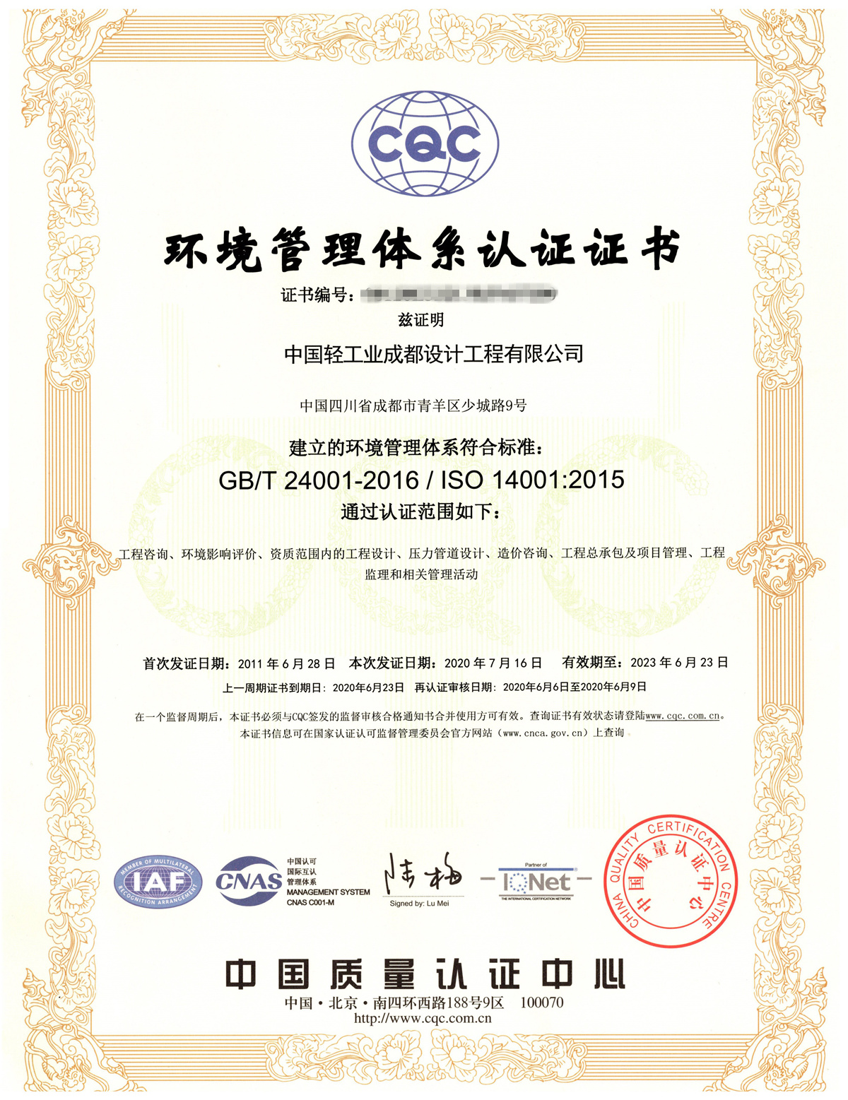 環(huán)境管理體系認(rèn)證證書